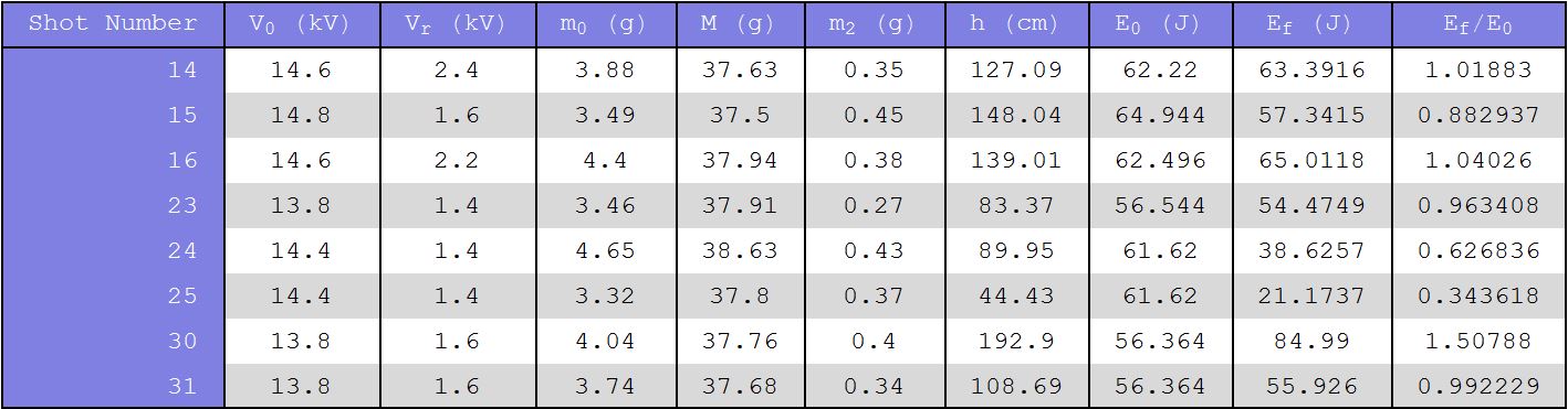 - Shots 1 through 3 and 4 through 5 seem to be in two different classes as far as input pulse energy is concerned. This may have to do with the amount of contact resistance or dissipation in the circuit, which may change from shot to shot.