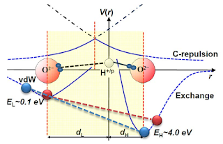 | Illustration of two possible hydrogen-covalent bond lengths: the "weak" red state and the "strong" blue state Figure from Zhang et al. (2013) |